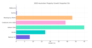 - Affordable suburbs: Lower-priced markets are booming. For example, Kalbarri (WA) house values are up +40% and Cranbrook (QLD) units +29%. Fringe Perth areas like Mandogalup jumped ~33%.