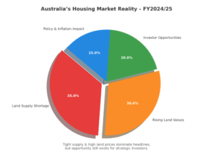 Recent data from the Housing Industry Association (HIA) confirms what many buyers are experiencing on the ground: land prices are surging. In FY2024/25, the national median lot price surged by 6.8%, which was three times faster than inflation. This stark price increase has made land costs the main hurdle in achieving Australia’s 1.2 million homes target, an issue becoming increasingly visible in the property market.