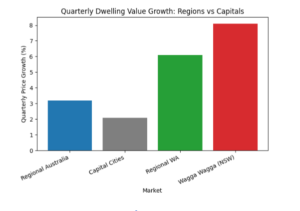 New data show that regional Australia’s housing market is booming compared to the capitals. In the three months to January, regional values rose 3.2% versus 2.1% in the combined capitals. This reflects ongoing affordability pressure and a wave of buyers moving to the regions. Driven by high city prices and tight supply, many households are escaping to country markets. For example, Western Australian regions saw 6.1% growth, and Wagga Wagga (NSW) jumped 8.1% over the quarter.